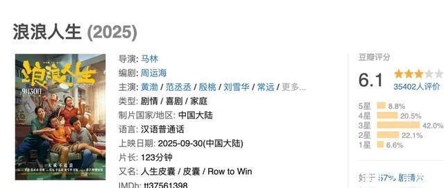 其实,《浪浪人生》的评分不是很高,有3万人打出了6.1分的成绩,大部分人都给出了3星的中评。 可以说一点也不惊艳,顶多算是一部中庸的及格线附近的喜剧片了。 电影由黄渤,范丞丞,殷桃等人主演,是一部家庭喜剧。 有中生演员也有青年演员,但该片的问题是很多的,前后的割裂感很重,编剧也是想一出是一出。 包括剧中角色的思维,都缺乏动机。 作为喜剧,缺乏了笑点和让人难忘的地方; 作为剧情片,也是剧情老套,鸡汤味十足; 不过,在如今的电影市场 ,哪怕“再冷”,喜剧电影都是有一定的受众的,而口碑对于电影的影响并不是非常大。 要说到国庆档期的终极赢家,还要数它了。