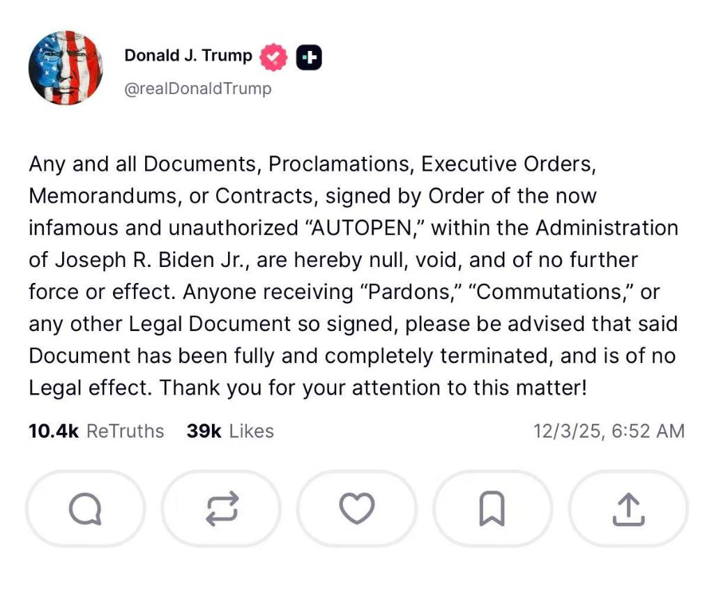 特朗普当天在社交平台“真实社交”上发文说:“任何收到以该方式签署的‘赦免令’‘减刑令’或其他任何法律文件的人请注意,上述文件已被完全终止,不具备任何法律效力。”