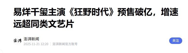 信源来源:2025.11.21 澎湃新闻 易烊千玺主演《狂野时代》预售破亿,增速远超同类文艺片