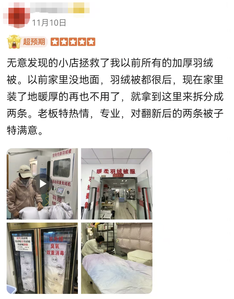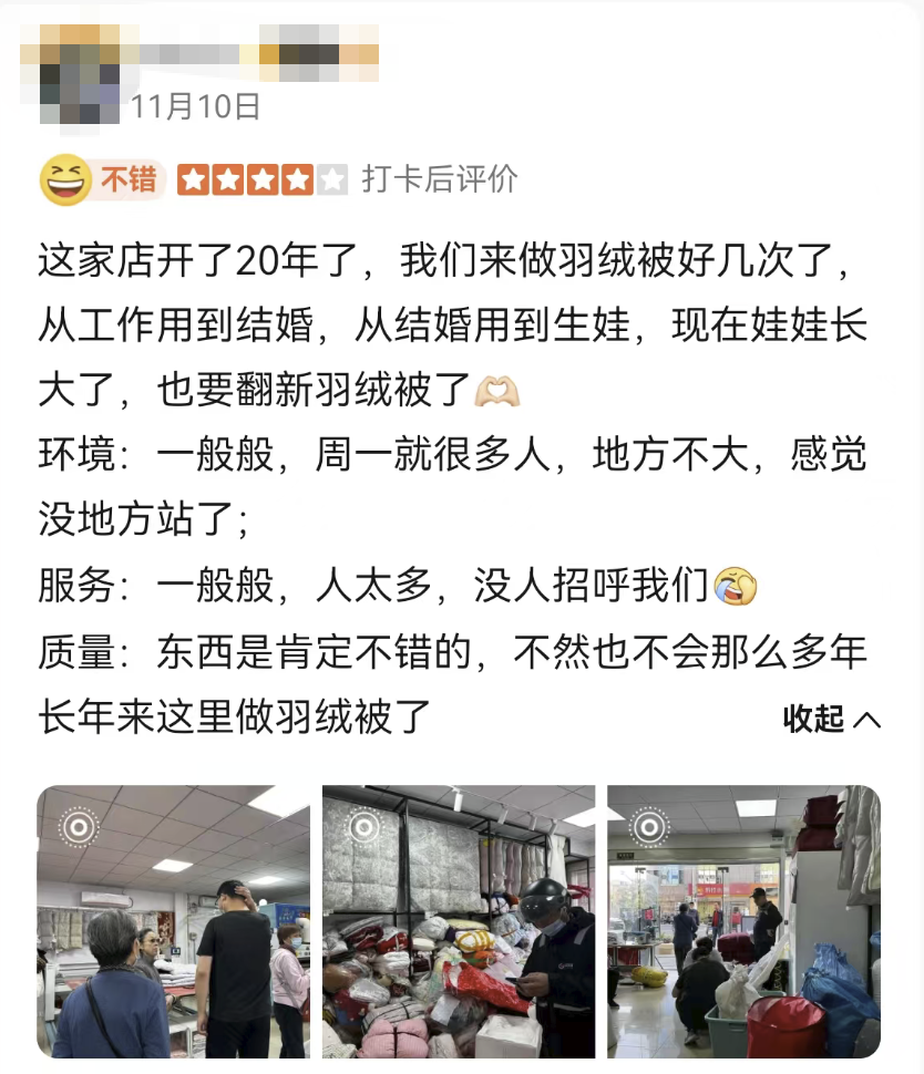 还有附近的老客人表示这家老店已经开了20年自己从工作、结婚、生娃一直在这里做羽绒被还有翻新被子