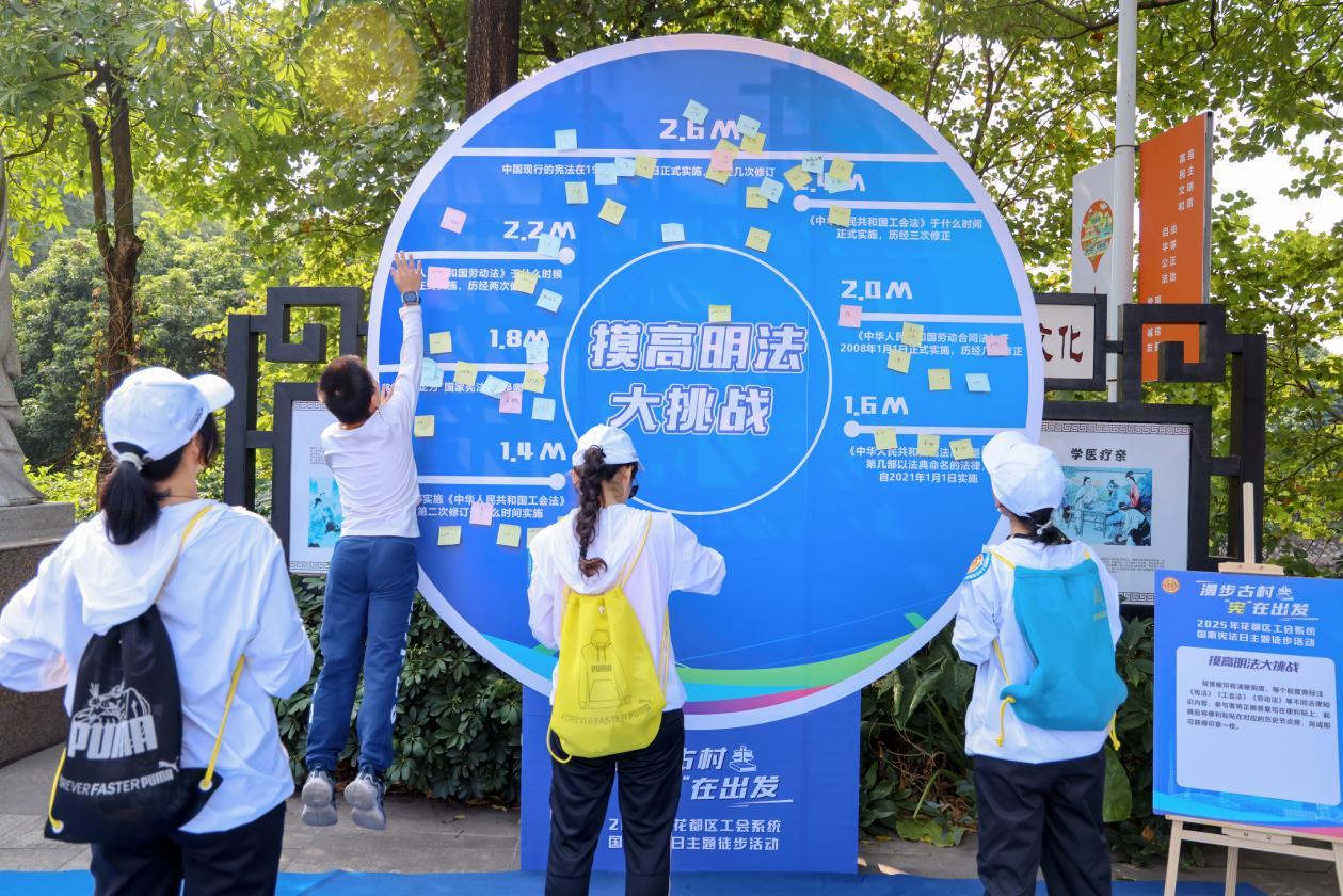 作为花都区“宪法宣传周”的特色活动,本次活动打破传统普法单向灌输模式,将法治教育与全民健身、古村文旅、“百县千镇万村高质量发展工程”(下称“百千万工程”)实践深度融合,打造“行走的法治课堂”。徒步线路串联起藏书院村洪拳广场、横岗村、塱头村云涯公祠等特色场点,沿途既有青砖黛瓦的明清古建,又有焕新升级的乡村风貌,让参与者在移步换景中感受“百千万工程”带来的乡村蝶变,更在互动体验中深化对法律的认知。